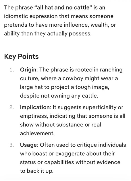 「all hat and no cattle」という表現は、