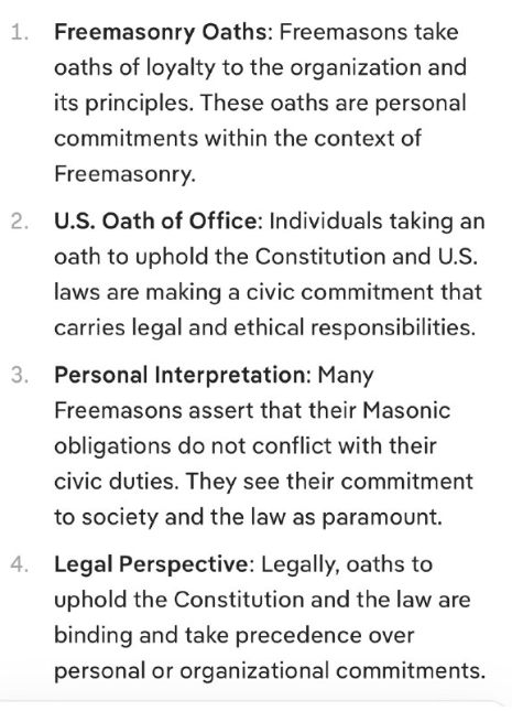 - 個人的解釈:多くのフリーメイソンは、フリーメイソンとしての義務と市民としての責務は矛盾しないと主張しています。彼らは、社会と法に対する責任を最優先に考えています。