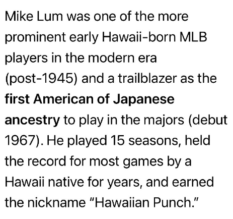 マイク・ラムは、近代(1945年以降)におけるハワイ生まれのMLB選手の中でも特に著名な選手の一人であり、メジャーリーグでプレーした初の日系アメリカ人として先駆者となった(デビューは1967年)。15シーズンにわたりプレーし、長年にわたりハワイ出身選手としての最多出場記録を保持し、「ハワイアン・パンチ」というニックネームで親しまれた。