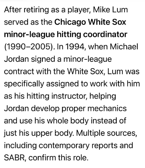 選手引退後、マイク・ラムはシカゴ・ホワイトソックスのマイナーリーグ打撃コーディネーターを務めた(1990年~2005年)。1994年、マイケル・ジョーダンがホワイトソックスとマイナーリーグ契約を結んだ際、ラムはジョーダンの打撃指導者として特別に任命され、ジョーダンが正しい打撃フォームを身につけ、上半身だけでなく全身を使うように指導した。