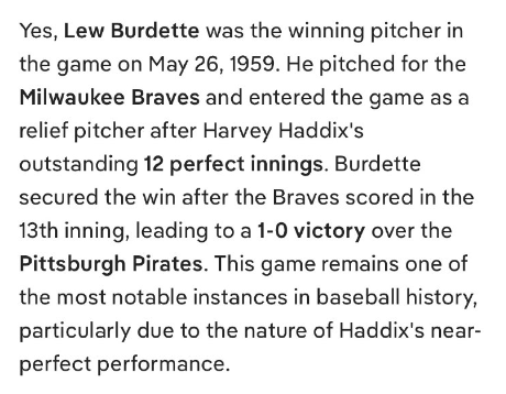 はい、1959年5月26日の試合で勝利投手となったのはルー・バーデットでした。彼はミルウォーキー・ブレーブスに所属し、ハービー・ハディックスの12イニングに及ぶ見事なパーフェクトピッチングの後、リリーフ投手として登板しました。ブレーブスは13回に得点し、バーデットが勝利投手となり、ピッツバーグ・パイレーツに1対0で勝利しました。この試合は、特にハディックスのほぼ完璧な投球内容から、野球史に残る名勝負の一つとして語り継がれています。