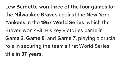 ルー・バーデットは、1957年のワールドシリーズでミルウォーキー・ブレーブス対ニューヨーク・ヤンキースの4試合中3試合に勝利し、ブレーブスは4勝3敗でシリーズを制した。彼の重要な勝利は第2戦、第5戦、第7戦で挙げたもので、37年ぶりのワールドシリーズ制覇に決定的な役割を果たした。