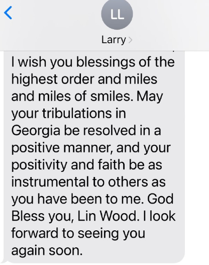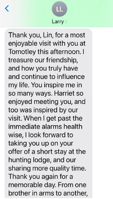 ラリーより > リン、今日の午後、トモトリーであなたと過ごした楽しい時間を本当にありがとう。
