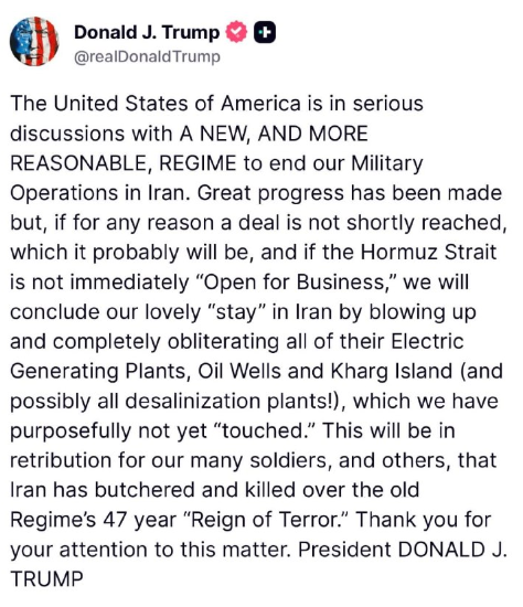 3月30日 ホルムズ海峡が直ちに「ビジネスに開放」されない場合、イランでの「滞在」を終えるべく、イランのすべての発電所、油田、ハルグ島(そしておそらくすべての海水淡水化プラントも!)を爆破し、完全に破壊します。