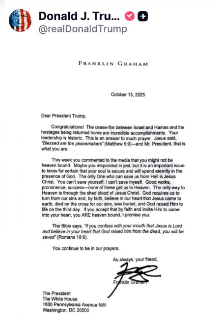それを明確にした上で、グラハムが2025年10月15日にトランプ大統領に宛てた手紙は、聖書(私は欽定訳聖書をお勧めします)のメッセージを正しく描写しています。