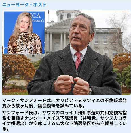 ヌッツィ氏は、サウスカロライナ州にあるサンフォード氏の自宅で「一度だけセックスをした」と主張している、とリッツァ氏は疑惑の密会について  書いたSubstackの記事に書いている。サンフォード氏のスキャンダルは、ヌッツィ氏が保健長官ロバート・F・ケネディ・ジュニア氏との「セクスティング」関係が疑われた後、ニューヨーク・マガジンの仕事を辞めた後に明るみに出た。