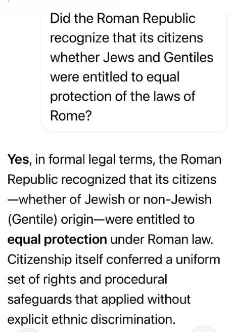 はい、正式な法的用語で言えば、ローマ共和国は市民がユダヤ人であろうと非ユダヤ人(異邦人)であろうと、ローマ法の下で平等な保護を受ける権利があると認めていました。