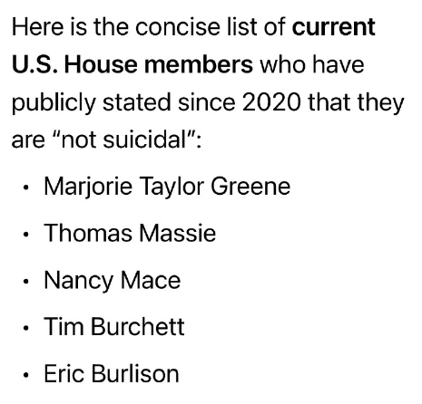 2020年以降に「自殺願望はない」と公言した現職の米国下院議員の簡潔なリストは以下のとおりです。