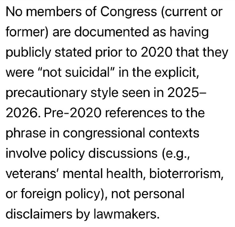 現職または元議員で、2020年以前に、2025年から2026年に見られたような、明確かつ予防的な表現で「自殺願望はない」と公に表明した人物は記録に残っていない。2020年以前の議会におけるこの表現は、政策議論(例えば、退役軍人のメンタルヘルス、バイオテロ、外交政策など)に関連するものであり、議員による個人的な表明ではない。