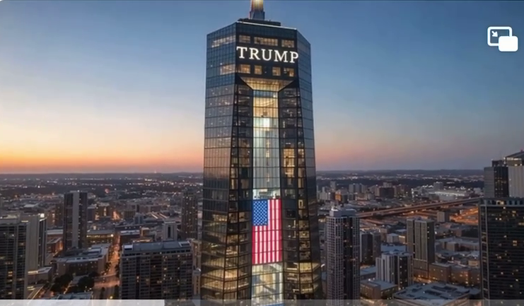 画像には、超高層ビルの外観に大きく「TRUMP」と表示され、アメリカ国旗が映し出されている様子が写っています。