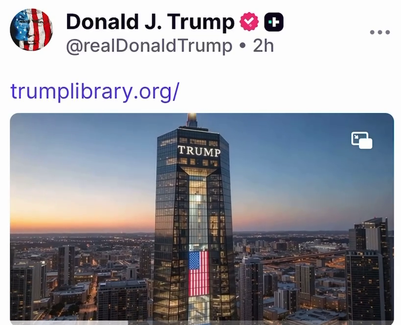 トランプ氏の公式アカウントからの投稿で、ドナルド・J・トランプ大統領図書館に関するウェブサイトへのリンクが含まれています。