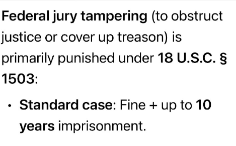 連邦陪審員への働きかけ(司法妨害または反逆罪の隠蔽)は、主に合衆国法典第18編第1503条に基づき処罰されます。標準的な刑罰は、罰金刑に加え、最長10年の懲役刑です。