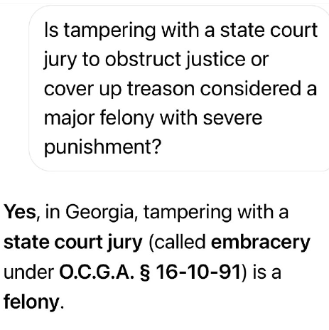 はい、ジョージア州では、州裁判所の陪審員を買収する行為(ジョージア州法典第16-10-91条では「陪審員買収」と呼ばれる)は、重罪です。