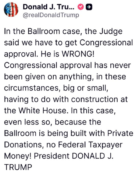 ボールルームの件で、裁判官は議会の承認が必要だと言いました。