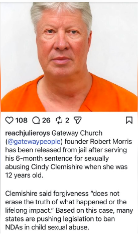 ゲートウェイ・チャーチ(@gatewaypeople)の創設者、ロバート・モリス氏は、シンディ・クレミシャーさん(当時12歳)への性的虐待で服役していた6か月の刑期を終え、釈放されました。