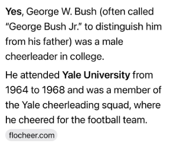 はい、ジョージ・W・ブッシュ(父親と区別するために「ジョージ・ブッシュ・ジュニア」と呼ばれることが多い)は、大学時代に男子チアリーダーでした。