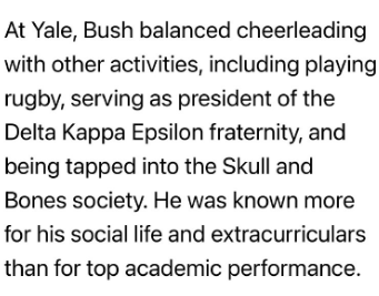 イェール大学時代、ブッシュはチアリーディングと並行して、ラグビー、デルタ・カッパ・イプシロン友愛会の会長、秘密結社スカル・アンド・ボーンズへの入会など、様々な活動に励んだ。彼は優秀な学業成績よりも、社交生活や課外活動で知られていた。