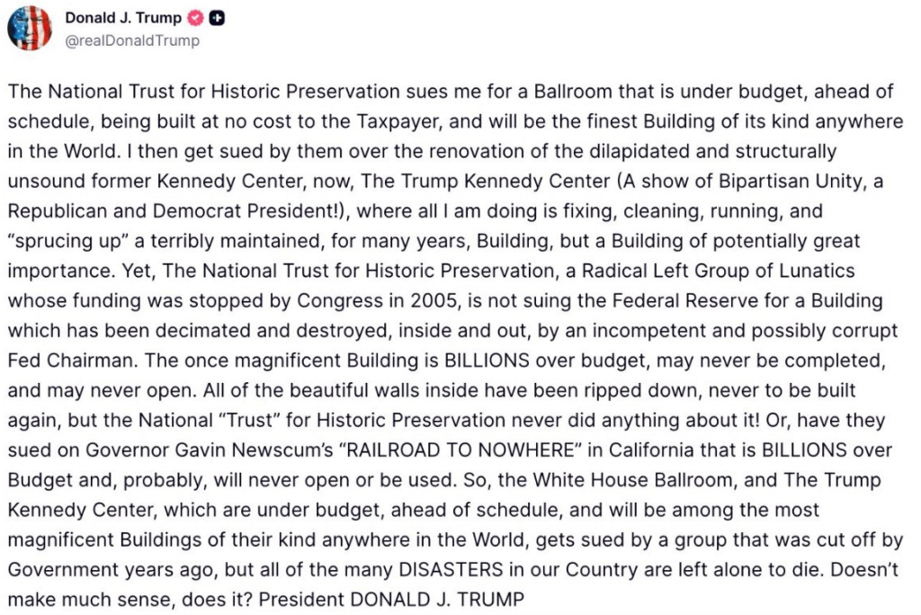 全米歴史保存トラストは、予算を下回り、予定より早く完成し、納税者の負担なしで建設され、世界でも類を見ない最高の建物となるであろう舞踏室の建設をめぐって私を訴えました。その後、老朽化し構造的に不安定な旧ケネディ・センター(現在はトランプ・ケネディ・センター、共和党と民主党の大統領による超党派の結束の象徴!)の改修をめぐって、彼らから訴えられました。私がやっているのは、長年ひどく手入れされていなかった建物を修理し、清掃し、運営し、そして「見栄えを良くする」ことだけです。しかし、この建物は潜在的に非常に重要な建物です。それなのに、2005年に議会によって資金提供が停止された過激左派の狂人集団である全米歴史保存トラストは、無能で恐らく腐敗した連邦準備制度理事会議長によって内外ともに荒廃し破壊された建物について、連邦準備制度を訴えていません。かつて壮麗だった建物は、予算を数十億ドルも超過し、完成しないかもしれないし、開館しないかもしれない。