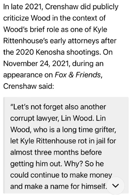 2021年後半、クレンショー氏はウッド氏を公に批判しました。ウッド氏は、2020年のケノーシャ銃乱射事件後、カイル・リッテンハウス氏の初期の弁護士として短期間務めていたことを批判しました。2021年11月24日、FOX & Friendsに出演した際、クレンショー氏は次のように述べました。