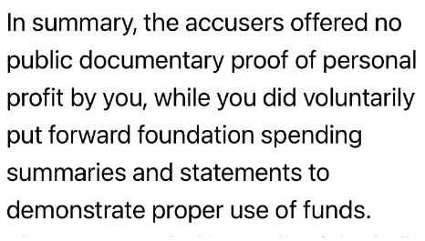 要約すると、告発者は、あなたが個人的な利益を得たことを公に証明する文書を一切提出していませんが、あなたは、資金の適切な使用を証明するために、財団の支出概要と明細書を自主的に提出しています。