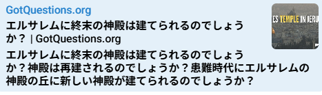 神殿が建設されるのを見ると、まさに終末が近づいていることを確信できます。反キリストが支配し、教会は既に携挙され、艱難時代の前半は過ぎ去っているでしょう。しかし、人々が救いを求めてキリストのもとに来る時間はまだ残っています。