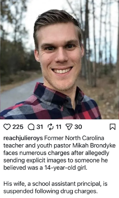 reachjulieroys ノースカロライナ州の元教師で青年牧師のミカ・ブロンダイク氏は、14歳の少女だと信じていた人物にわいせつな画像を送ったとして、数々の罪に問われています。