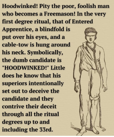 騙された!哀れにも愚かなフリーメイソン入会者は哀れだ!最初の位階、見習い入会の儀式では、目隠しをされ、首にはロープがかけられる。象徴的に、この愚かな候補者は「騙された」のだ!彼は、上司たちが意図的に候補者を騙そうとし、33位階までを含むすべての儀式を通して欺瞞を企てていることを知らない。