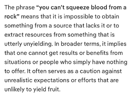 「石から血を絞り出すことはできない」という表現は、何かが欠けているものから何かを得ること、あるいは全く固執するものから資源を引き出すことは不可能であることを意味します。より広い意味では、何も提供できない状況や人々からは、結果や利益を得ることはできないことを意味します。これはしばしば、非現実的な期待や、成果を生みそうにない努力に対する警告として機能します。