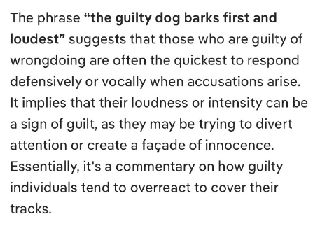 「罪を犯した犬は最初に、そして最も大きな声で吠える」という表現は、罪を犯した者は、非難されると、防御的に、あるいは声高に反応するのが最も早いということを示唆しています。