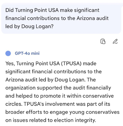 Turning Point USAは、ダグ・ローガン氏が率いるアリゾナ州の監査に多額の資金提供を行いましたか?