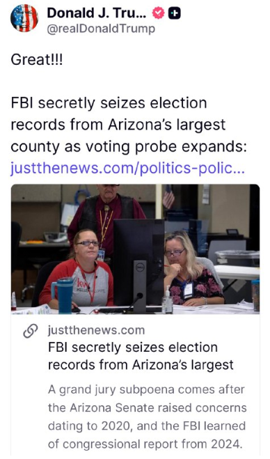 速報:トランプ大統領は、FBIがアリゾナ州マリコパ郡の選挙記録を秘密裏に押収したと発表しました。