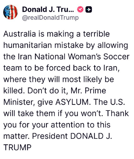 オーストラリアは、イラン女子サッカー代表チームをイランに強制送還させ、