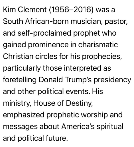 キム・クレメント(1956-2016)は、南アフリカ生まれの音楽家、牧師、そして自称預言者であり、カリスマ派キリスト教界で、特にドナルド・トランプ大統領の就任やその他の政治的出来事を予言したと解釈される預言によって、その名を馳せました。彼のミニストリー「ハウス・オブ・デスティニー」は、預言的な礼拝と、アメリカの精神的・政治的未来に関するメッセージを重視していました。