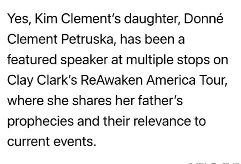 はい、キム・クレメントの娘、ドネ・クレメント・ペトルスカは、クレイ・クラークの「ReAwaken America Tour」の複数の会場で基調講演者として登壇し、父親の予言と