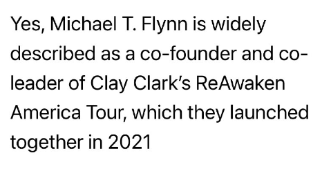 はい、マイケル・T・フリンは、2021年に一緒に立ち上げたクレイ・クラークの「ReAwaken America Tour」の共同創設者兼共同リーダーとして広く知られています。