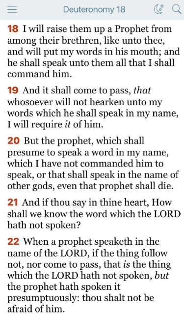 18節 わたしは彼らの兄弟の中から、あなたのような預言者を立て、わたしの言葉を彼の口に授ける。彼はわたしが命じるすべてのことを彼らに語るであろう。