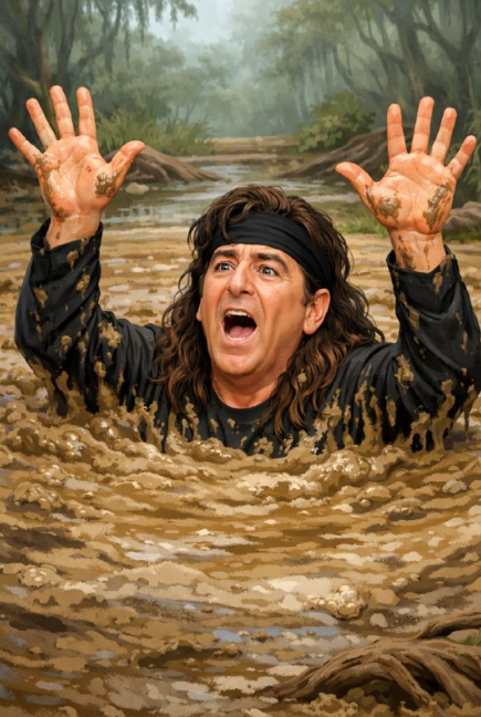 提供された画像は、泥の中に沈み込み、助けを求めて両手を上げている男性を描いた絵画です。この作品は、ミュージシャンのオジー・オズボーンをモデルにした肖像画の一種と考えられます。検索結果には、彼をモチーフにしたパレットナイフとブラシによる絵画(90 x 70 cm)や、同様の表情・スタイルで描かれたアート作品が含まれています。