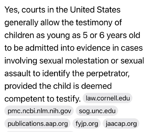 はい、米国の裁判所は、性的虐待や性的暴行を含む事件において、加害者を特定するために、5歳や6歳といった幼い子供の証言を証拠として採用することを一般的に認めています。ただし、その子供が証言能力があるとみなされる場合に限ります。law.cornell.edu