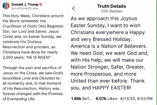 「この聖週間、メラニアと私は、キリスト教徒と共に祈りを捧げ、私たちの主であり救い主であるイエス・キリストの磔刑と復活を祝います。イエス・キリストは、死を克服し、私たちを罪から解放し、全人類のために天国の門を開いてくださった、生ける神の御子です。」 – トランプ大統領