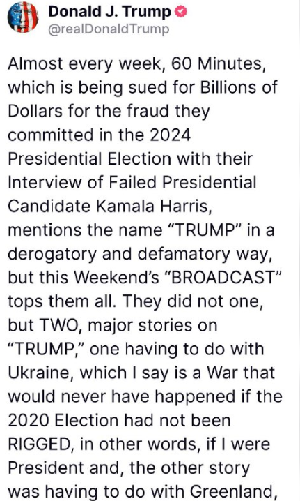 ほぼ毎週、2024年大統領選挙で敗北した大統領候補カマラ・ハリス氏へのインタビューで不正行為を行ったとして、数十億ドルの損害賠償を請求されている「60 Minutes」は、「トランプ」という名前を侮辱的かつ中傷的な形で言及していますが、今週末の「放送」はそれらすべてを凌駕しています。彼らは「トランプ」に関する主要なニュースを1つどころか2つも報道しました。1つはウクライナに関するもので、これは2020年の選挙が不正でなければ、つまり私が大統領だったら決して起こらなかった戦争だと私は思います。そしてもう1つはグリーンランドに関するものでした。彼らは放送免許を失いました!連邦通信委員会(FCC)は、高く評価されているブレンダン・カー委員長率いる委員会の指導の下、彼らの違法行為に対し、最大限の、そして相当な罰金と処罰を科すでしょう。CBSはかつてないほど制御不能な状態に陥っており、このことに対して大きな代償を払うべきです。アメリカを再び偉大な国にしましょう!