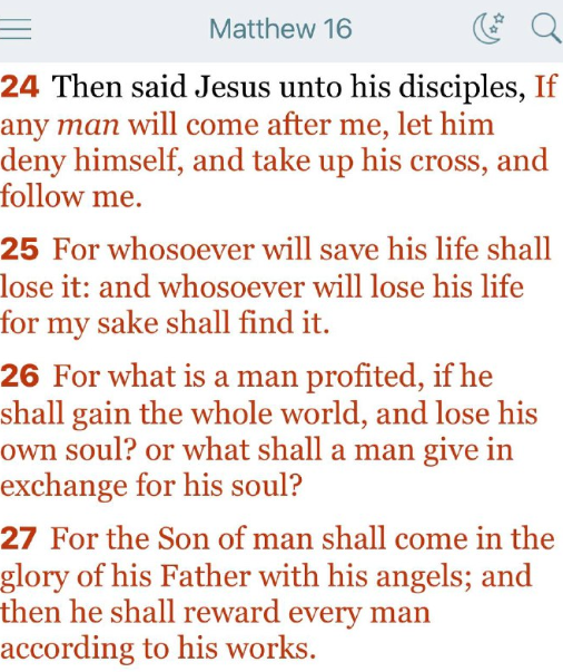 24 そのとき、イエスは弟子たちに言われた。「わたしについて来たいと思う者は、自分を捨て、自分の十字架を負って、わたしに従って来なさい。