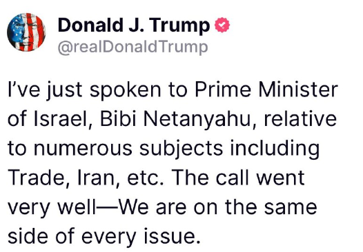 イスラエルのビビ・ネタニヤフ首相と、貿易、イランなど、様々な問題について話し合いました。電話会談は非常にうまくいきました。私たちはあらゆる問題において同じ立場です。