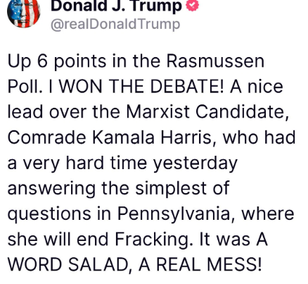 マルクス主義者候補の同志カマラ・ハリスを見事にリードした。彼女は昨日、ペンシルベニア州で最も簡単な質問に答えるのに非常に苦労した。