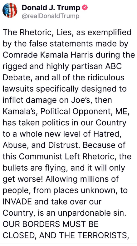 ABC討論会でのカマラ・ハリス同志の虚偽の発言に代表されるレトリック、嘘、そしてジョーの、そしてカマラの、政治的対立者である私に損害を与えるために特別に計画された馬鹿げた訴訟のすべてが、私たちの国の政治を憎悪、虐待、不信のまったく新しいレベルへと引き上げている。