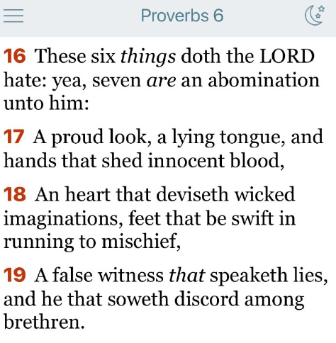 19節 偽りを語る偽証者、兄弟の間に争いをまき散らす者。