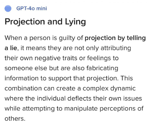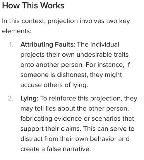 2. 嘘をつく:この投影を強化するために、その人は相手について嘘をつき、自分の主張を裏付ける証拠やシナリオを捏造することがあります。これは、自分の行動から注意をそらし、虚偽の物語を作り出すのに役立ちます。
