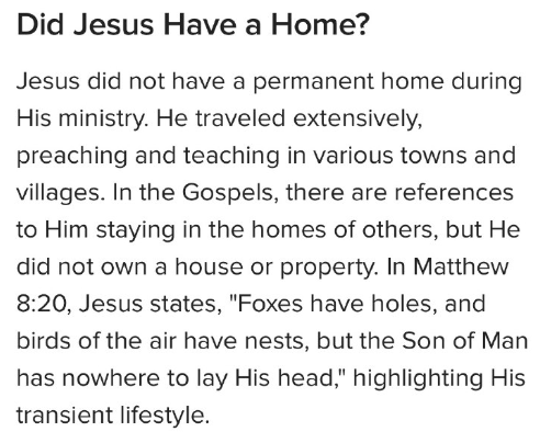 家や土地を所有していませんでした。マタイによる福音書8章20節で、イエスは「狐には穴があり、空の鳥には巣がある。しかし、人の子には頭を横たえる所がない」と述べ、イエスの移り気な生活を強調しています。