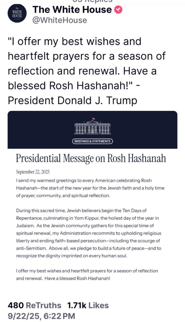 「反省と再生の季節に、心からの祈りと心からの願いを捧げます。祝福されたロシュ・ハシャナをお過ごしください!」 – ドナルド・J・トランプ大統領