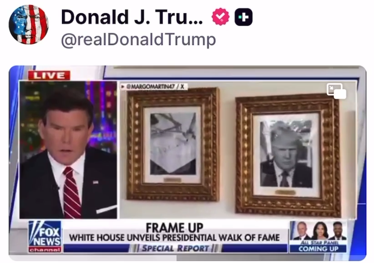 大統領執務室のすぐ外、列柱沿いに新たに設置されたこの展示では、額装された写真が展示されている。
