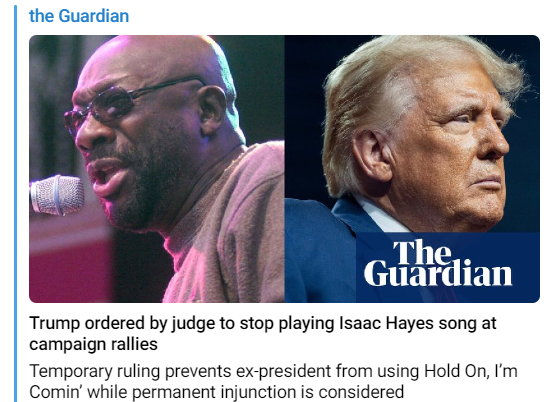 トランプ氏、アイザック・ヘイズの曲を選挙集会で流すことを止めるよう裁判官に命じられる。